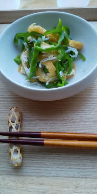 2021-05-03 小さいおかず 料理ファイル もう何十年も前のクロワッサンの切り抜きから作りました。ピーマンとじゃこと薄揚げの三杯酢。初夏になると食べたくなります。何てことないけど、大好きな和え物です。斜め千切りにしたピーマンをさっと熱湯にくぐらせ、カリッと焼いた薄揚げの千切りとジャコとを三杯酢で和え、ワシャワシャ食べます。ピーマン欲が満たされます。